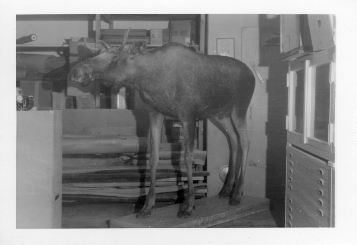 'Den monterade älgen i lödöserummet. Skåp med lådor och glasdörrar. :: Älgen nedmonterad 1970-01-08. Fynddatum: 1864-09-22. :: :: Fotograferad snett framifrån. :: :: Ingår i serie med fotonr. 5591:1-5.'