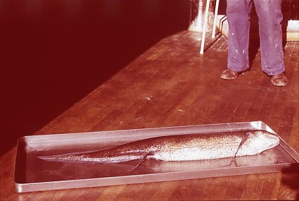 'Bilder en död lungfisk från akvariet. Avgjuten och placerad i basutställningen på Göteborgs Naturhistoriska museum, 1960. Avgjutningen gjord av Björn Wennerberg. :: :: Fotograferad på en bricka på ett bord. Magsidan av fisken synlig, i bakgrunden är även en persons ben synliga.'