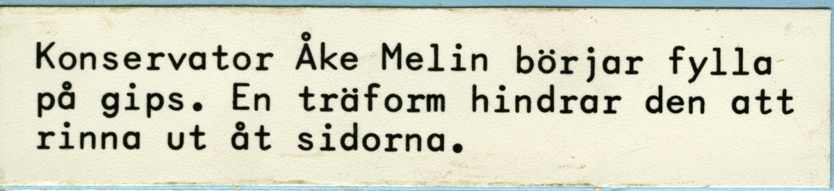 'Ingår i en serie bilder med texter (för utställning) på avgjutningen av håkäringen i Göteborgs Naturhistoriska museums fiskutställning. :: Åke Melin var konservator och Johan Lindström målade.Fynddatum: 1977-07-06. :: :: Text till bild: ''Konserator Åke Melin börjar fylla på gips'''