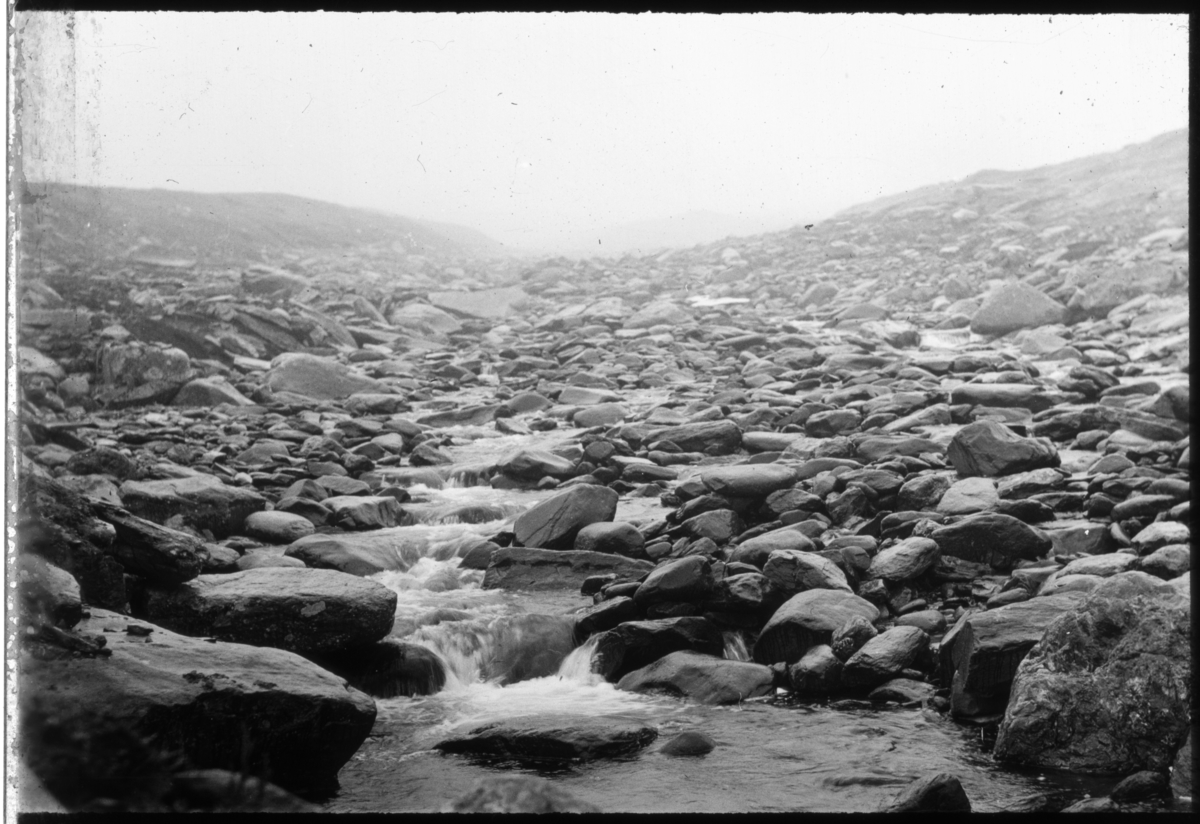 'Bildtext: ''Vuorekjokk, i dimma.'' Vy med blocktäckt mark med framrinnande vattendrag. :: :: Ingår i serie med fotonr. 5167:1-8 numrerade med bildnr 231-238.'