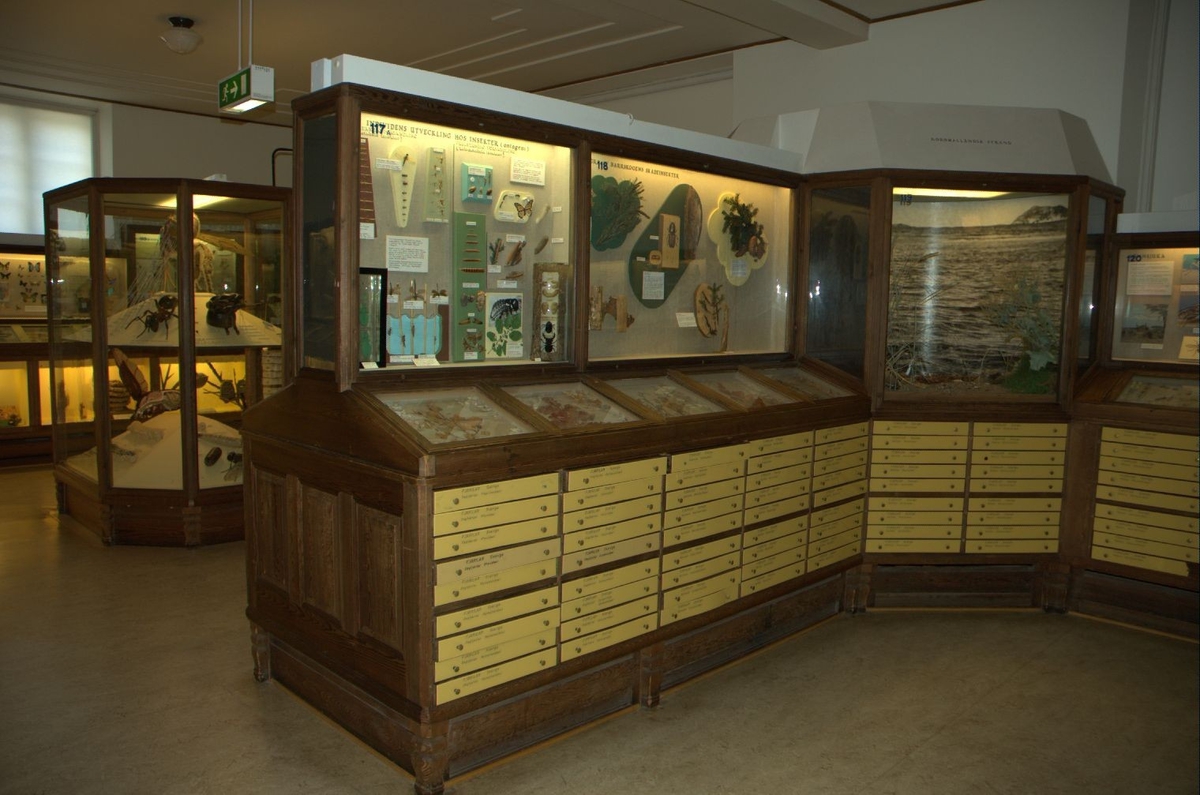 'Vy över montrar och lådor i utställningendelen om insekter. :: :: Fotonr. 7095 består av en bildserie som dokumenterar diverse utrymmen i byggnaden så som kontor, arbetsplatser, arbetsrum, magasin m.m. Bilder tagna före och efter olika ombyggnationer bl.a.'