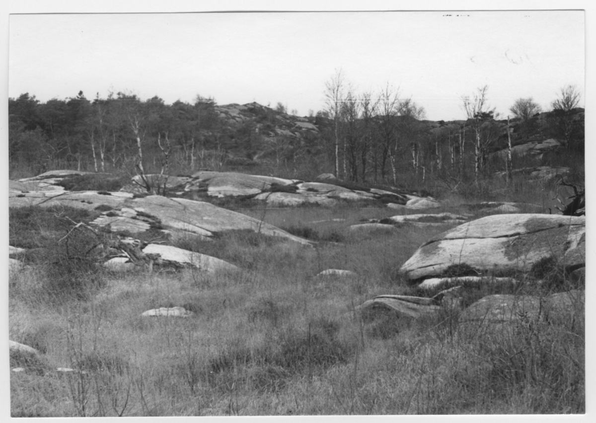 'Bildtext: ''Hällmark. Riktning 284.'' :: Kala hällar med partier med bl.a. björk. :: :: Ingår i serie med fotonr. 6970:1-1125, dokumentation av Hisingens naturgeografi, visande landskapsformerna i stora drag och gjord inför exploateringen av området. Platserna för fotograferingen finns utsatta på karta i skala 1:4000 som finns på Göteborgs Naturhistoriska musem. Fotoriktningen mättes med kompass i gammalgrader.'
