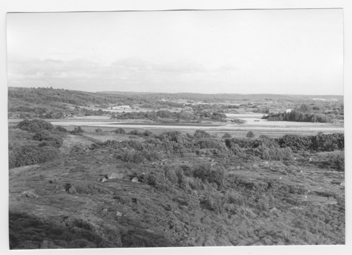 'Bildtext: ''Sedimentdalgång. Fåglevik. Riktning 110.'' :: Vy ner över dalgången med öppna fält, åkrar. I förgrunden berghällar med spridda stenblock. :: :: Ingår i serie med fotonr. 6970:1-1125, dokumentation av Hisingens naturgeografi, visande landskapsformerna i stora drag och gjord inför exploateringen av området. Platserna för fotograferingen finns utsatta på karta i skala 1:4000 som finns på Göteborgs Naturhistoriska musem. Fotoriktningen mättes med kompass i gammalgrader.'