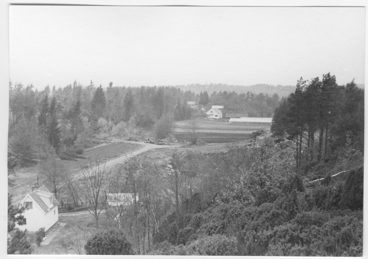 'Bildtext: ''Sedimentdal. Riktning 296.'' :: I förgrunden enbuskbevuxet berg. Vy ned över del av sedimentdalen med öppna fält, åkermark och hus, vägar och skogspartier. :: :: Ingår i serie med fotonr. 6970:1-1125, dokumentation av Hisingens naturgeografi, visande landskapsformerna i stora drag och gjord inför exploateringen av området. Platserna för fotograferingen finns utsatta på karta i skala 1:4000 som finns på Göteborgs Naturhistoriska musem. Fotoriktningen mättes med kompass i gammalgrader.'