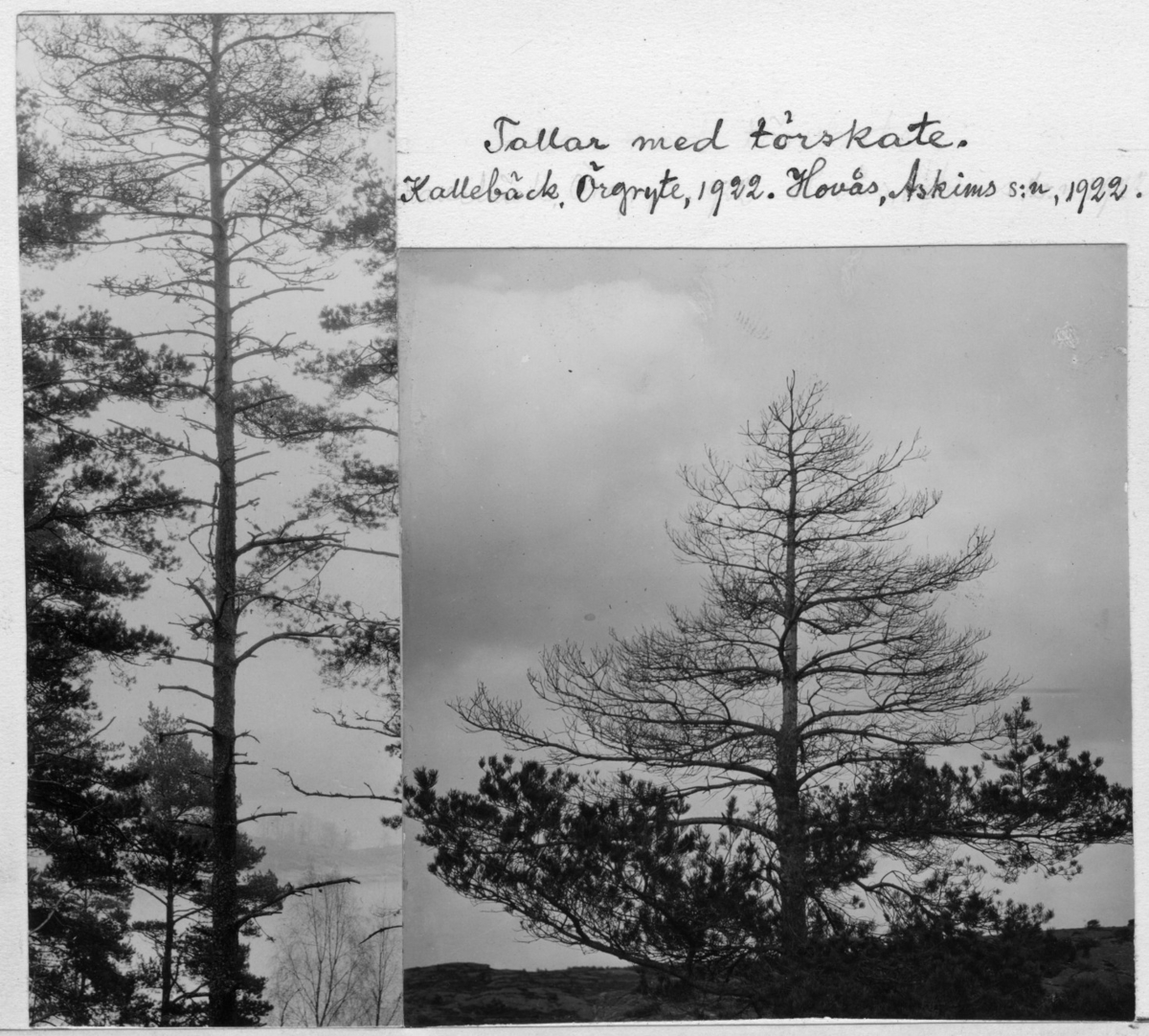 'Bildtext: ''Tallar med törskate.'' Till vänster i Kallebäck, till höger i Hovås. Närbilder på tallar som angripits av rostsvamp. :: :: Fotonr. 7047:24-27 indelad under rubriken ''Svampar (Skadliga, giftiga, ätliga).'' Ingår i serie med fotonr. 7046:1-383, 7047:1-33 och 7048:1-67 med bilder från Länsjägmästare John Lindners bildarkiv.'