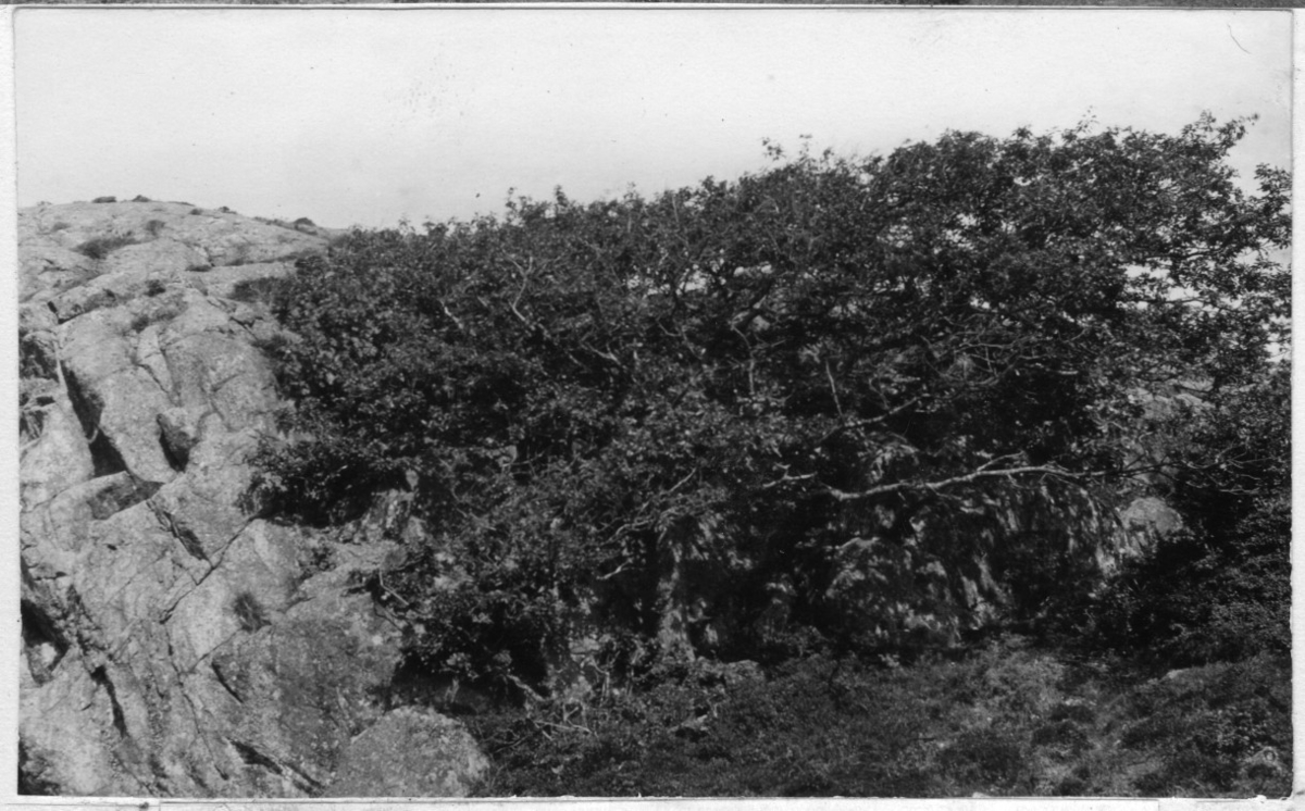 'Bildtext: ''Ekar, som på grund av blåsten icke kunna växa högre än berget.'' Närbild på ekar som växer i skydd av berg. :: :: Fotonr. 7047:2-23 indelad under rubriken ''Atmosfäriska skador på skogen, skogseld och släckning därav.'' Ingår i serie med fotonr. 7046:1-383, 7047:1-33 och 7048:1-67 med bilder från Länsjägmästare John Lindners bildarkiv.'