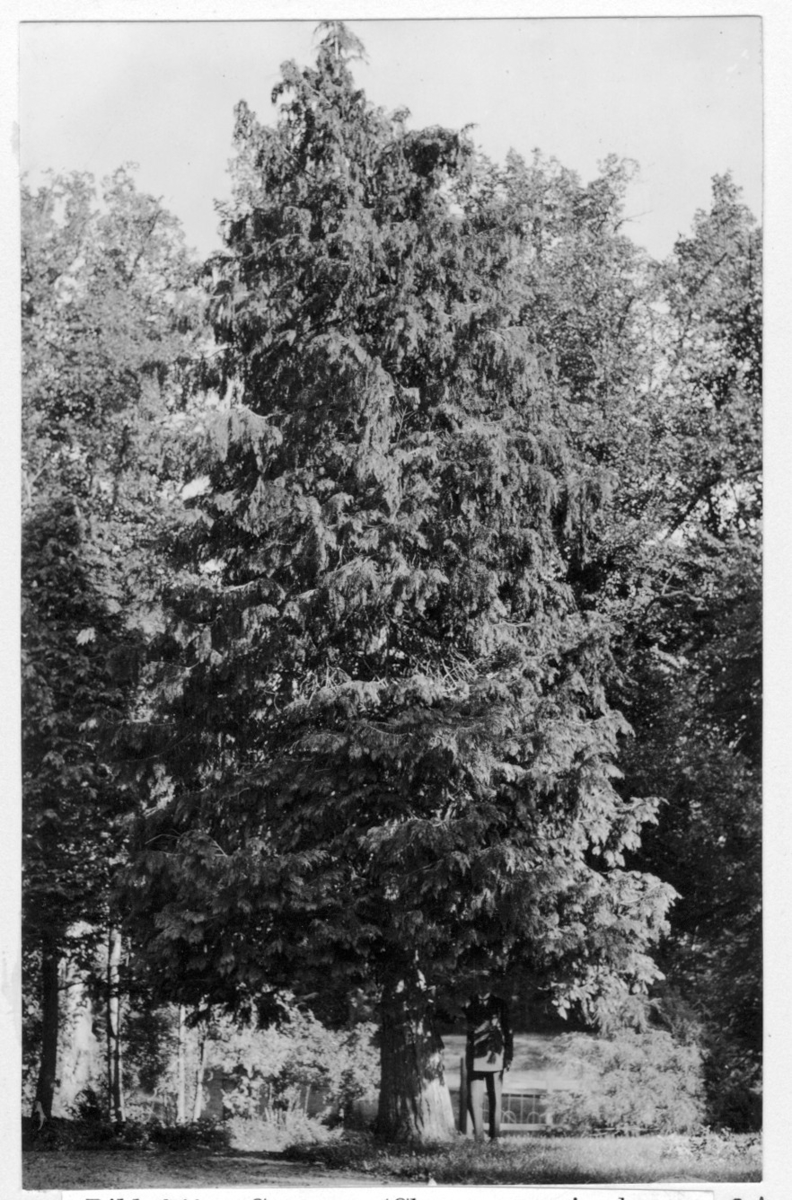 'Bildtext: ''Bild 249. Cypress (Chamaecyparis lawsoniana). Skencypress. Västra Nordamerika.'' 1 man stående invid stammen under 1 cypress. Trädvegetation i bakgrunden. :: :: Fotonr. 7046:186-212 indelade som ''Utländska träd'' i Göteborgs län och Bohus län''.Ingår i serie med fotonr. 7046:1-383, 7047:1-33 och 7048:1-67 med bilder från Länsjägmästare John Lindners bildarkiv.'