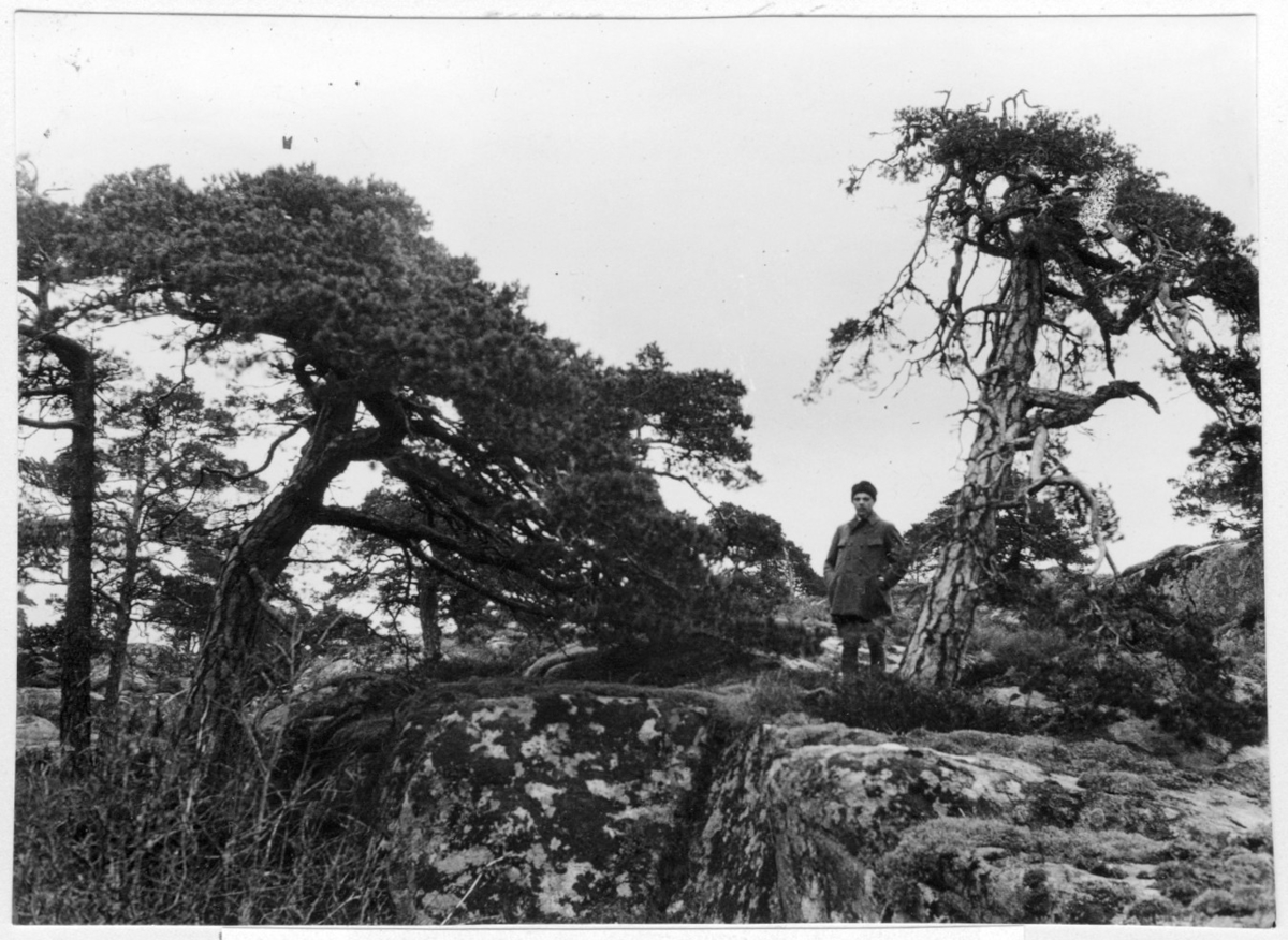 'Bildtext: ''Tallar på berg i exponerat läge.'' 1 man står invid tallar på kalt berg. :: :: Fotonr. 7046:119-185 indelade som ''Märkvärdiga träd i Göteborgs län och Bohus län''. Ingår i serie med fotonr. 7046:1-383, 7047:1-33 och 7048:1-67 med bilder från Länsjägmästare John Lindners bildarkiv.'