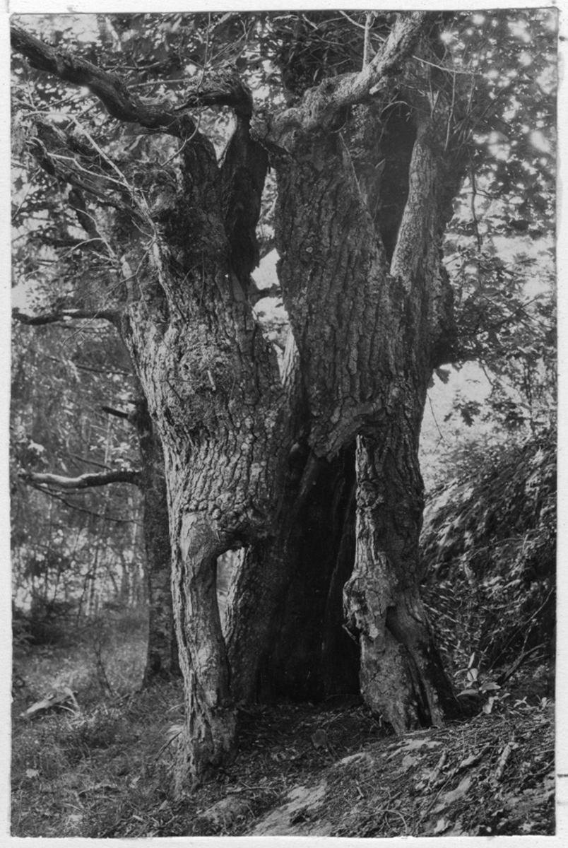 'Bildtext: ''Ek.'' Närbild på ihålig stam hos ek. :: :: Fotonr. 7046:293-306 indelade som ''Skogsmarken. Trädens byggnad och livsföreteelser.''. Ingår i serie med fotonr. 7046:1-383, 7047:1-33 och 7048:1-67 med bilder från Länsjägmästare John Lindners bildarkiv.'