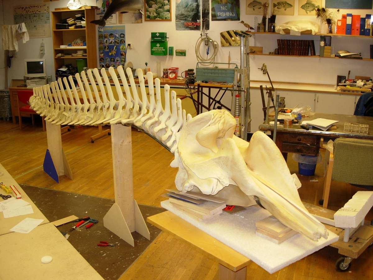 'Ateljen, Monteringsarbetet med näbbvalen, hane, Valders skelett. :: Kranium och ryggrad ihopsatta. :: :: Skelettet till näbbvalen är monterat och hänger i valsalen på Göteborgs Naturhistoriska Museum. Då näbbvalen sågs utmed kusten kom den att kallas Valder i media. :: :: Ingår i serie med fotonr. 7106 med bilder på näbbvalen som levande och under arbetet med att montera skelettet.'