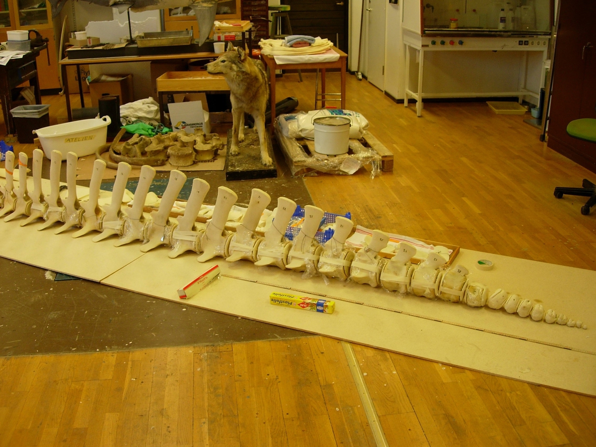'Monteringsarbetet med näbbvalen, hane, Valders skelett. :: Ryggraden utlagd på golvet i ateljén. :: Ateljen :: Skelettet till näbbvalen är monterat och hänger i valsalen på Göteborgs Naturhistoriska Museum. Då näbbvalen sågs utmed kusten kom den att kallas Valder i media. :: :: Ingår i serie med fotonr. 7106 med bilder på näbbvalen som levande och under arbetet med att montera skelettet.'