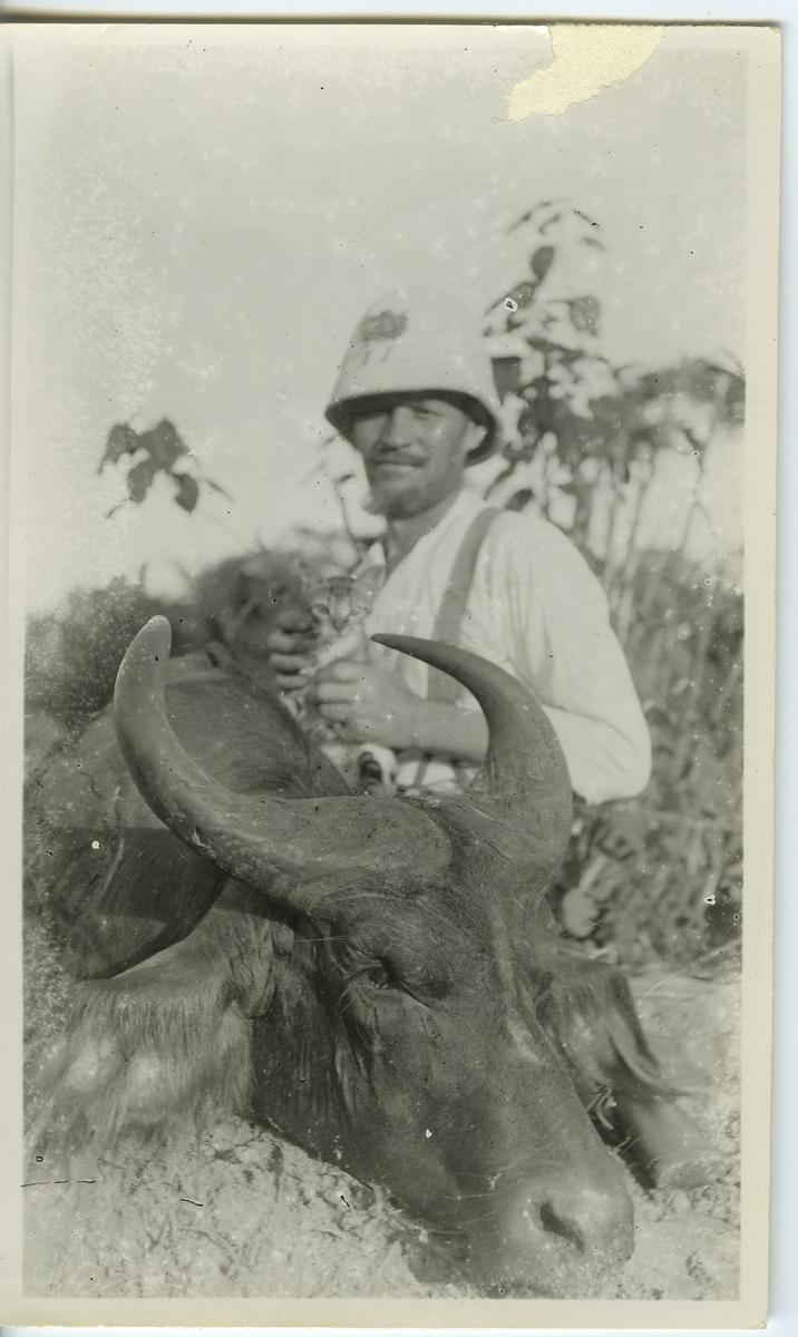'Svart buffel liggande, huvudet framifrån i närbild. 1 st man i skjorta, hatt och hängslen står på knä invid buffelns huvud. Håller en katt i famnen. :: :: Serie fotonr 983-996'