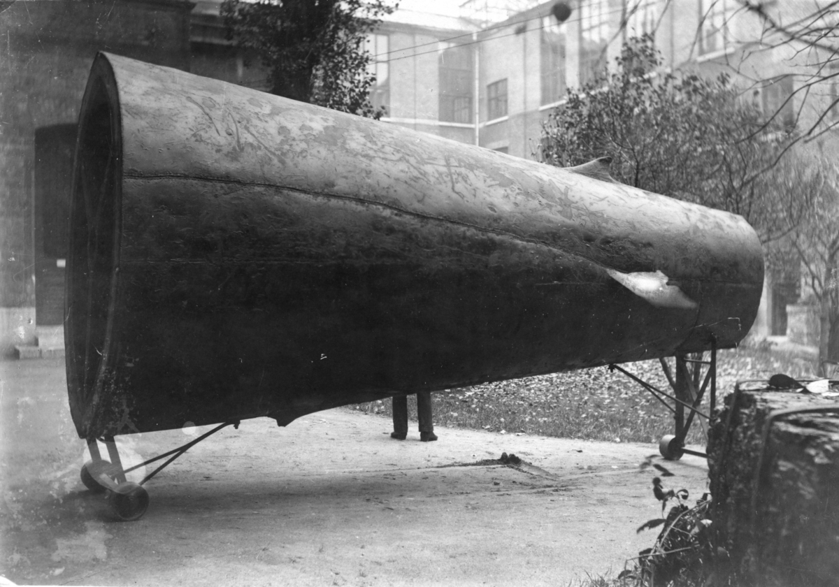 'Zoologiska avdelningens flytt: :: :: Stjärtsegmentet till valen utflyttas på gamla museigården, Malmska valen :: :: Bild i artikel ''När museets hvalfisk flyttar'' i Göteborgs Aftonblad 1918-10-31.'