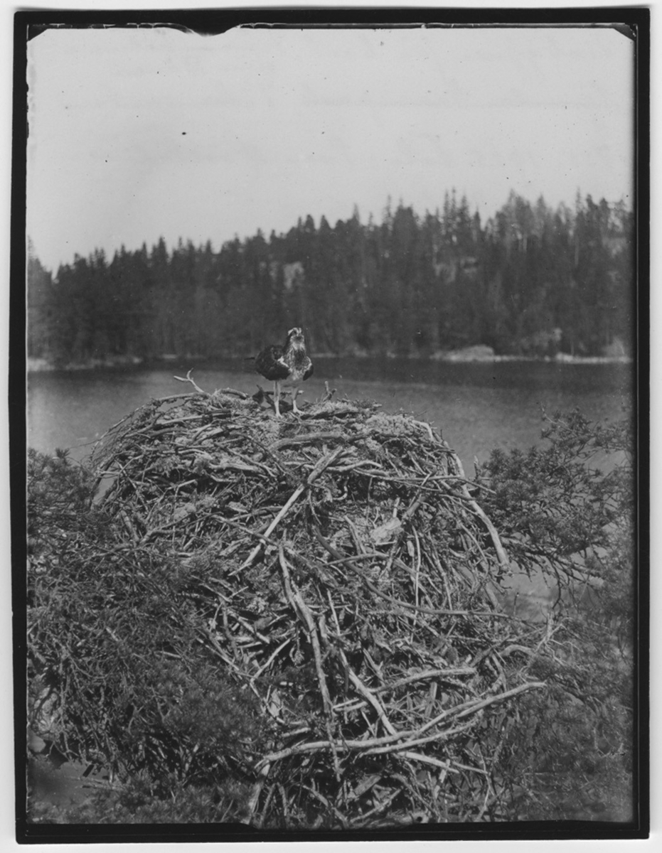 'Fiskgjuse på boet, i tall. Vy med sjö i bakgrunden. Se även fotonr. 1369. :: :: Se serie med fotonr. 1369-1371.'