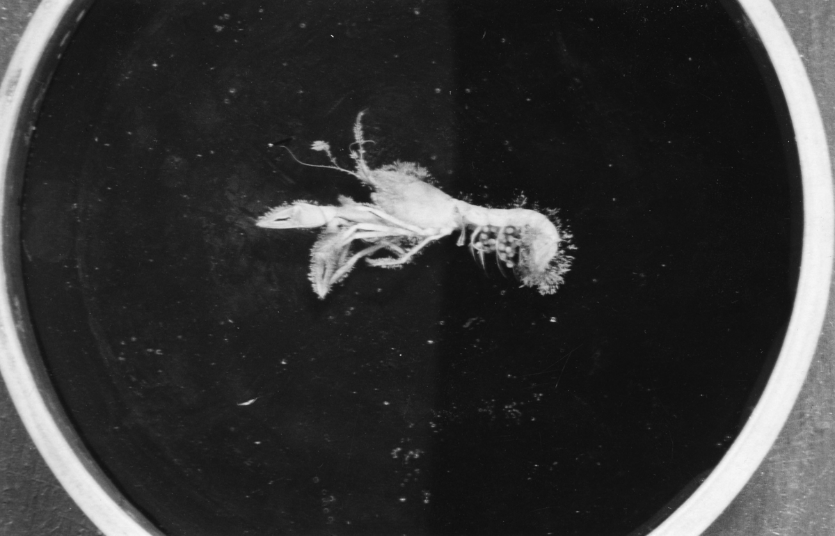 'Evertebrater insamlade under Akkaexpeditioner: :: :: Närbild på kräftdjur i glasskål. :: :: Ingår i serie med fotonr. 2235-2241.'