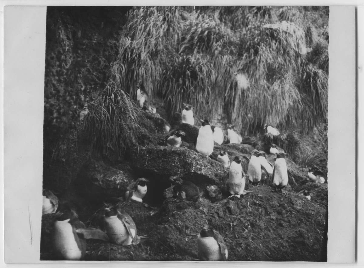 'Pingvinkoloni, ca 20 st klipphopparpingviner. Närbild. :: :: Ingår i serie med fotonr. 2003-2011.'