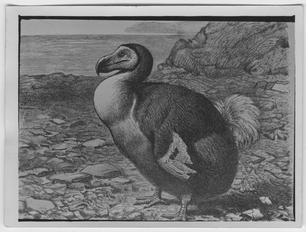 'Avfotograferad teckning av dront. Text på baksidan: ''Den i gängse handböcker oftast förekommande drontbilden''. :: :: :: Ingår i serie med fotonr. 2984-3010, foton och teckningar på dront och garfågel bl.a.'