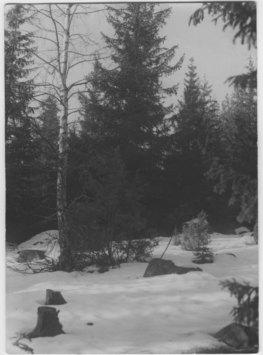 'Häckningsterräng för större korsnäbb. Granskog med björk i förgrunden. Vinterbild. Snöklädd mark. :: :: Ingår i serie med fotonr. 3495-3511.'