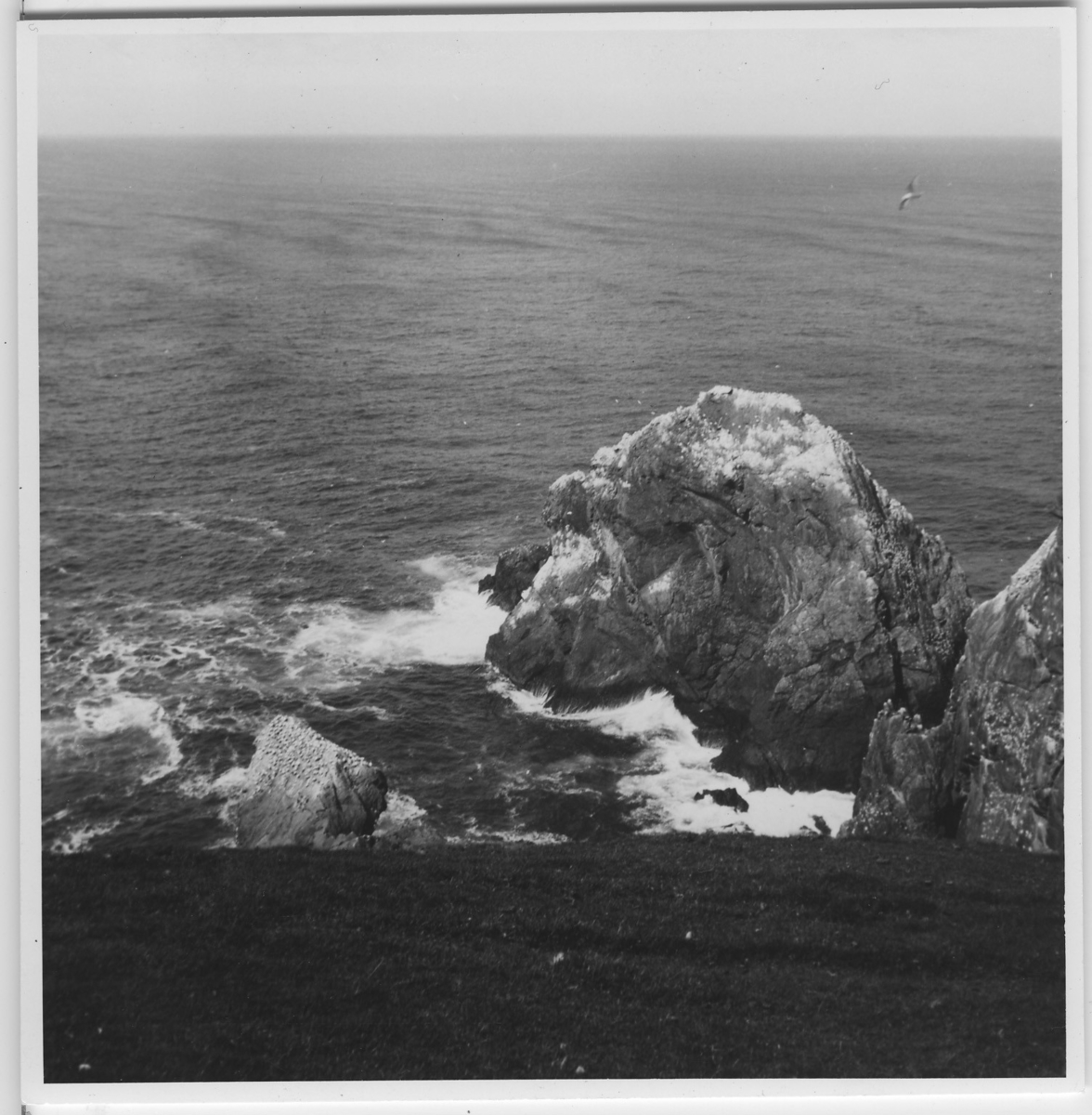 'Från ''Skageraks''-expeditionen till Hebriderna och Shetland: :: :: Vy över kust med klippor, från Hermaness, fågel synlig till höger (förstorad version av foto nr 4113:40). :: :: Ingår i serie med fotonr. 4113:1-82.'