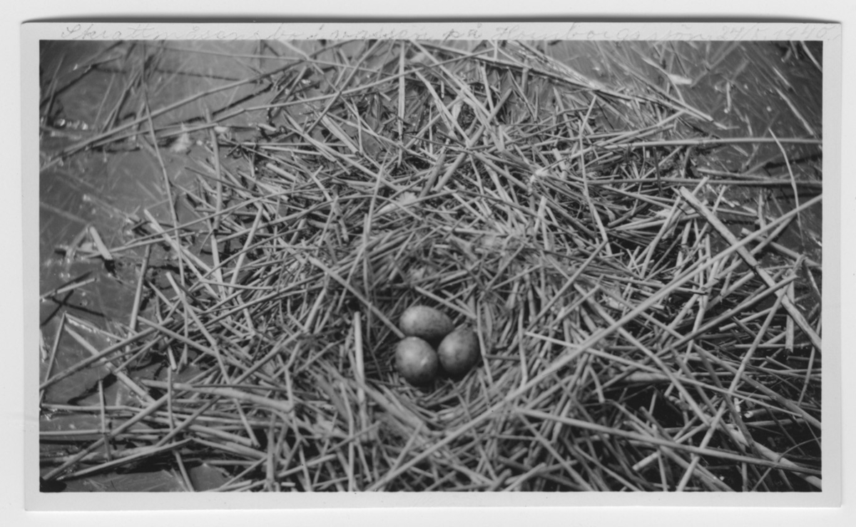 'Skrattmås, bo med 3 ägg, i vatten. Text på fotot: ''Skrattmåsens bo i vassen på Hornborgasjön.'' :: :: Ingår i serie med fotonr. 4140-4158.'