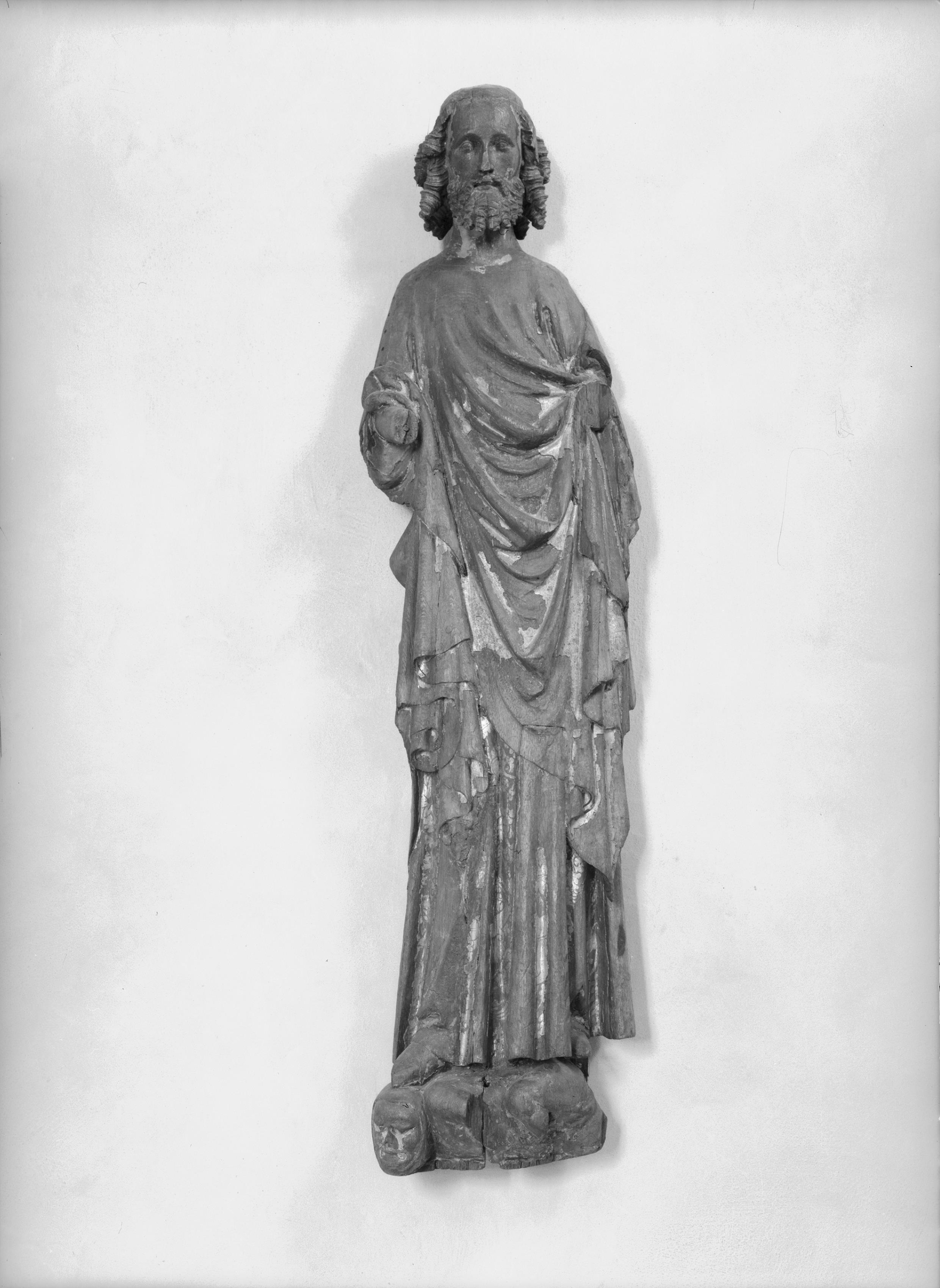 En skulptur av S:t Olof. Bild av ek: står på skalle. Bevarade rester av polykromin visar att manteln varit i guld med brokadmönster. Huvudet skulpterat runtom, ryggen urhålkad. Svenskt-franskt arbete från 1300-talets början (snabbinv). Saknar armar.