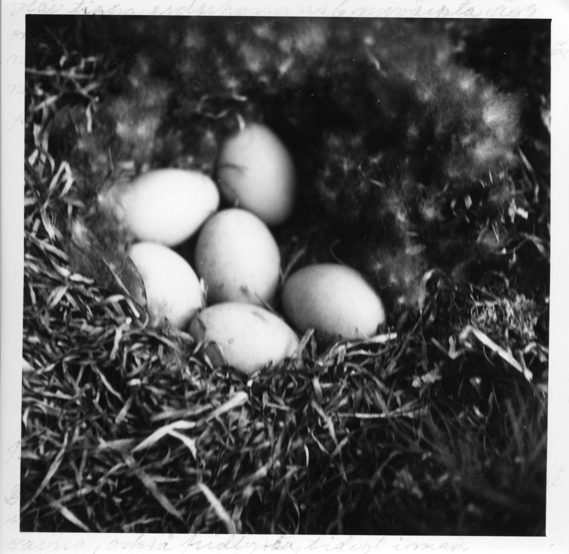 'Enligt anteckning på fotografiets baksida: :: ''Här ligger ejderhonans sex nyvärpta ägg omgivna av hennes dun och torr tång på norra stranden av det fridlysta Hammarnäs norr om Skanör, där en skärfläckkoloni på 20 par häckade. Bilden togs på 30 cm avstånd. Den sena häckningen beror på att enligt uppgift hennes ägg tagits av trutar på öarna, också fridlysta, tidigt i maj.'' :: :: Ingår i en serie med fotonr. 4512:1-57 med diverse foton av fågelbon med ägg och ungar. Varje fotografi har utförliga anteckningar på sin baksida, kopierade från framsidan, spår av de på framsidan är fortfarande synliga.'