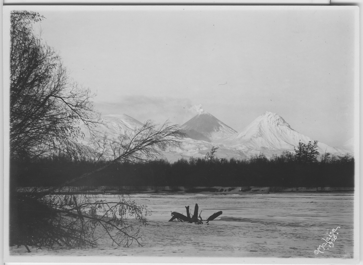 'Vy mot vulkaner, i förgrunden älv med is. :: :: (4+2+12, fr. SW.) :: 4 = vulkanen Ploskaja :: 2= v. Klutchevskaja :: 12=v. Kamen :: :: Serie fotonr 4916-4930. :: Kartskiss fotonr. 4916:1 visar motivens läge.'