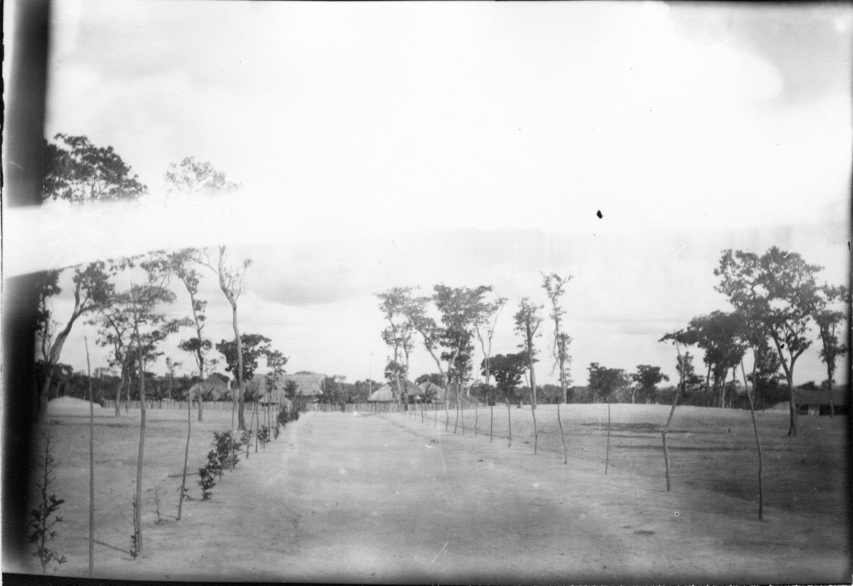 'Diverse fotografier från bl.a. dåvarande Nordrhodesia, nu Zambia, tagna av Konsul Magnus Leijer. :: :: Vy över grusallé ledande till ett antal byggnader, endast taken synliga. Vägen kantad av öppna ytor.'