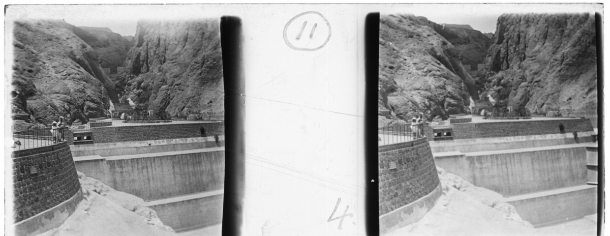 '2 personer (kvinnnor) stående ovanpå cisterner, tankar. Berg i bakgrunden. Vy uppåt bergen. :: Enligt text till fotot: ''Tanks of Aden, up-view.'' (Cisterner i Aden, vy uppåt.) :: :: Ingår i en serie med fotonr. 5240:1-17. Se även fotonr. 5237:1-16, 5238:1-18 och 5239:1-18, 5241:1-18.'