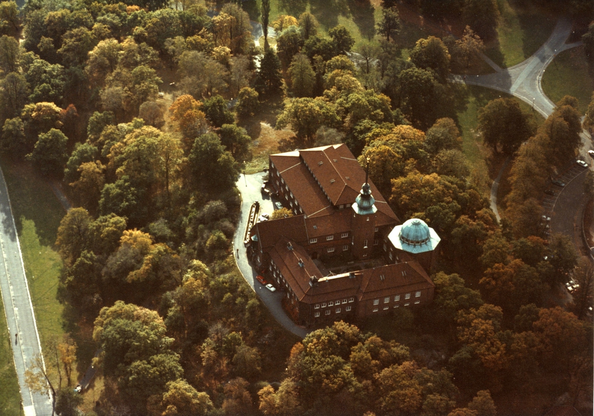 'Flygbild över museet sett från Rosengatan, sensommar. :: Bilden är tagen före tillbyggnaden.'