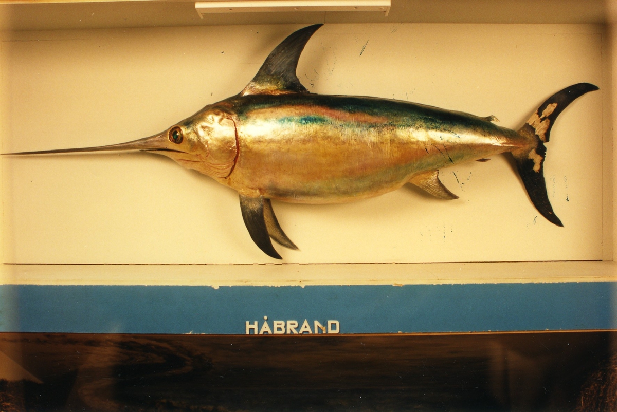 'Svärdfisk, B 235, H 90 D 30 cm. Fyndår 1905. :: Avgjutning från Malmö museum. I basutställningen, Göteborgs Naturhistoriska museum 2003. Avgjutningen gjord av Olof Gylling. :: :: Ingår i serie med fotonr. 6063:1-7 med bilder på avgjutningar gjorda av Olof Gylling och E. Einfeldt (gråhaj). Göteborgs Naturhistoriska museum har fått dessa avgjutningar som gåva från Malmö museum 1994-09-27.'
