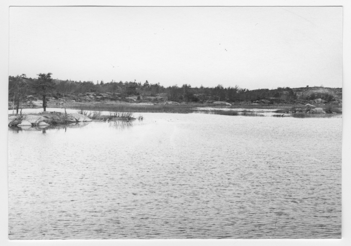 'Bildtext: ''Sjö. Riktning 334.'' :: Vy över vattensytan med holmar och på avstånd berghäll. :: :: Ingår i serie med fotonr. 6970:1-1125, dokumentation av Hisingens naturgeografi, visande landskapsformerna i stora drag och gjord inför exploateringen av området. Platserna för fotograferingen finns utsatta på karta i skala 1:4000 som finns på Göteborgs Naturhistoriska musem. Fotoriktningen mättes med kompass i gammalgrader.'