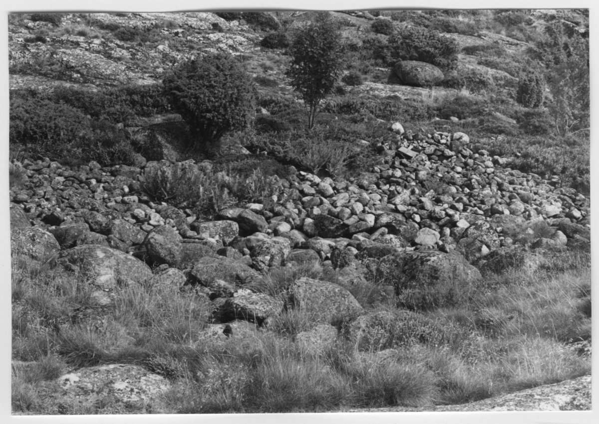 'Bildtext: ''Sänka med gammalt, rundat stenmaterial.'' Vy tagen uppifrån ner mot sänkan bevuxen med enar och buskar. Rundade stenblock av varienrande storlekar. :: :: Ingår i serie med fotonr. 6970:1-1125, dokumentation av Hisingens naturgeografi, visande landskapsformerna i stora drag och gjord inför exploateringen av området. Platserna för fotograferingen finns utsatta på karta i skala 1:4000 som finns på Göteborgs Naturhistoriska musem. Fotoriktningen mättes med kompass i gammalgrader.'