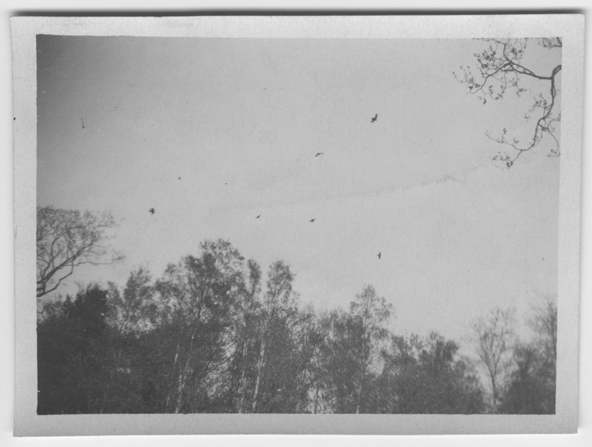 'Råksamhälle, träden på avstånd. Flygande råkor? Vy med trädtoppar och flygande fåglar. :: :: Ingår i serie med fotonr. 717-719.'