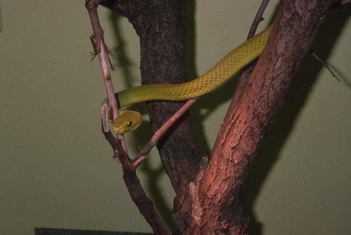 'Utställningen ''Dödliga skönheter'', giftormar, på Göteborgs Naturhistoriska museum, Utställningen pågick 8 maj till 5 december 2005. :: Närbild på orm. Terrarium. :: :: Ingår i serie med fotonr. 6946:1-27.'