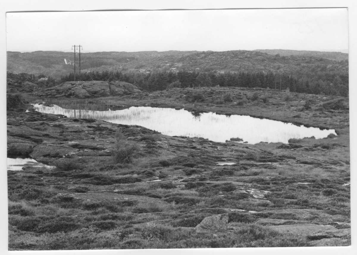 'Bildtext: ''Sjö i sänka på bergsplatå. Riktning 352.'' Vy med liten sjö med omgivande berghällar med ljungvegetation. :: :: Ingår i serie med fotonr. 6970:1-1125, dokumentation av Hisingens naturgeografi, visande landskapsformerna i stora drag och gjord inför exploateringen av området. Platserna för fotograferingen finns utsatta på karta i skala 1:4000 som finns på Göteborgs Naturhistoriska musem. Fotoriktningen mättes med kompass i gammalgrader.'