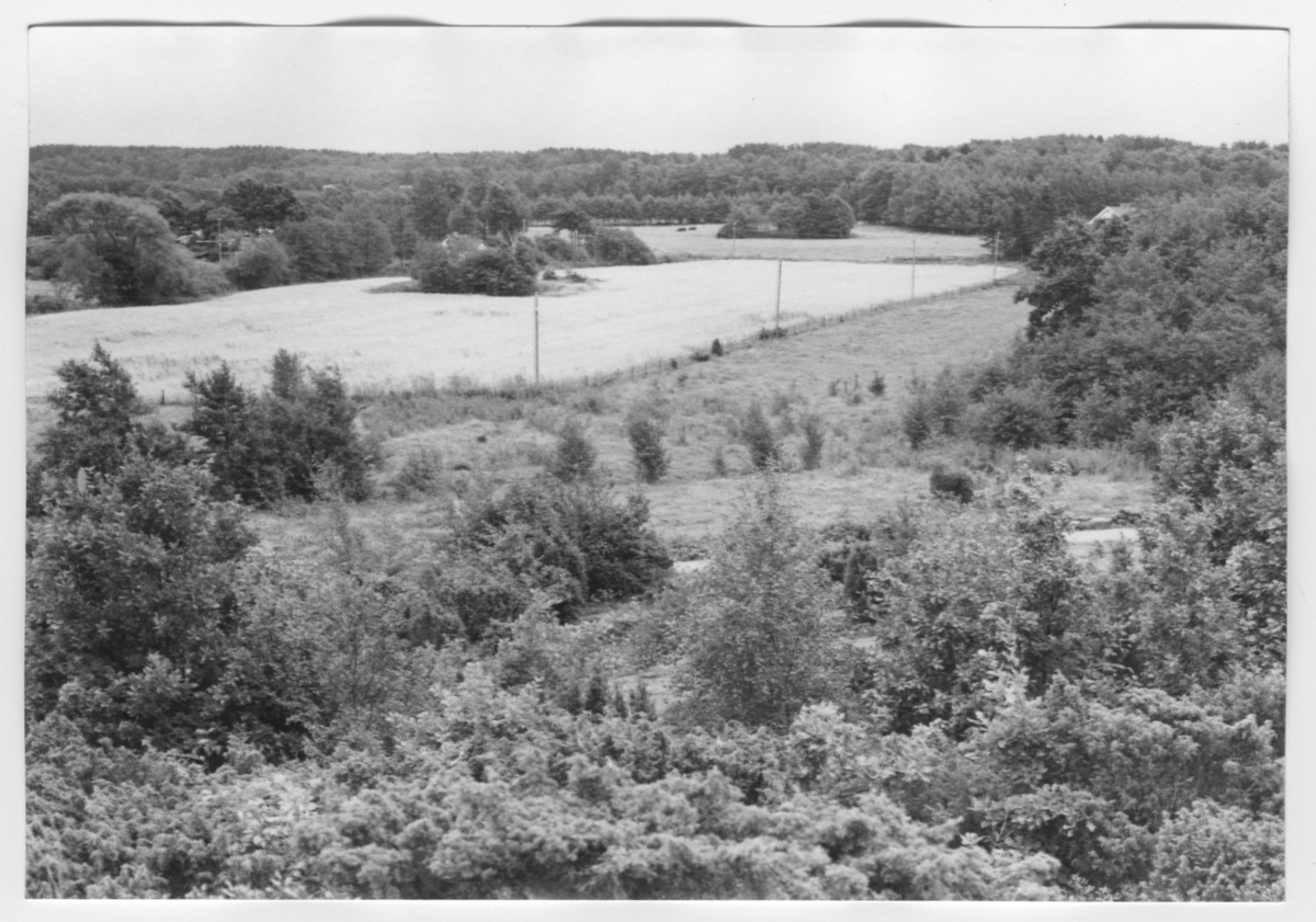 'Bildtext: ''Sedimentyta. Riktning 172.'' I förgrunden björk, en och ek. Vy ut över öppet fält, åker ev. betesmark med staket. Elledning. Hus till höger och bakom träddunge. Betalnde nötboskap. I bakgrunden skog. Åkerholme. :: :: Ingår i serie med fotonr. 6970:1-1125, dokumentation av Hisingens naturgeografi, visande landskapsformerna i stora drag och gjord inför exploateringen av området. Platserna för fotograferingen finns utsatta på karta i skala 1:4000 som finns på Göteborgs Naturhistoriska musem. Fotoriktningen mättes med kompass i gammalgrader.'
