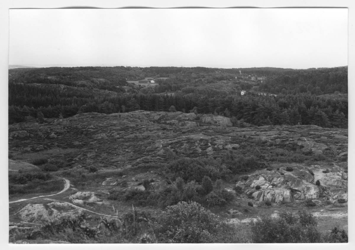 'Bildtext: ''Hällandskap. Riktning 160.'' :: Vy över berghällar med ljung och enbuskar. På avstånd barrträdsvegetation i lägre parti samt i fonden ev. en gård. :: :: Ingår i serie med fotonr. 6970:1-1125, dokumentation av Hisingens naturgeografi, visande landskapsformerna i stora drag och gjord inför exploateringen av området. Platserna för fotograferingen finns utsatta på karta i skala 1:4000 som finns på Göteborgs Naturhistoriska musem. Fotoriktningen mättes med kompass i gammalgrader.'