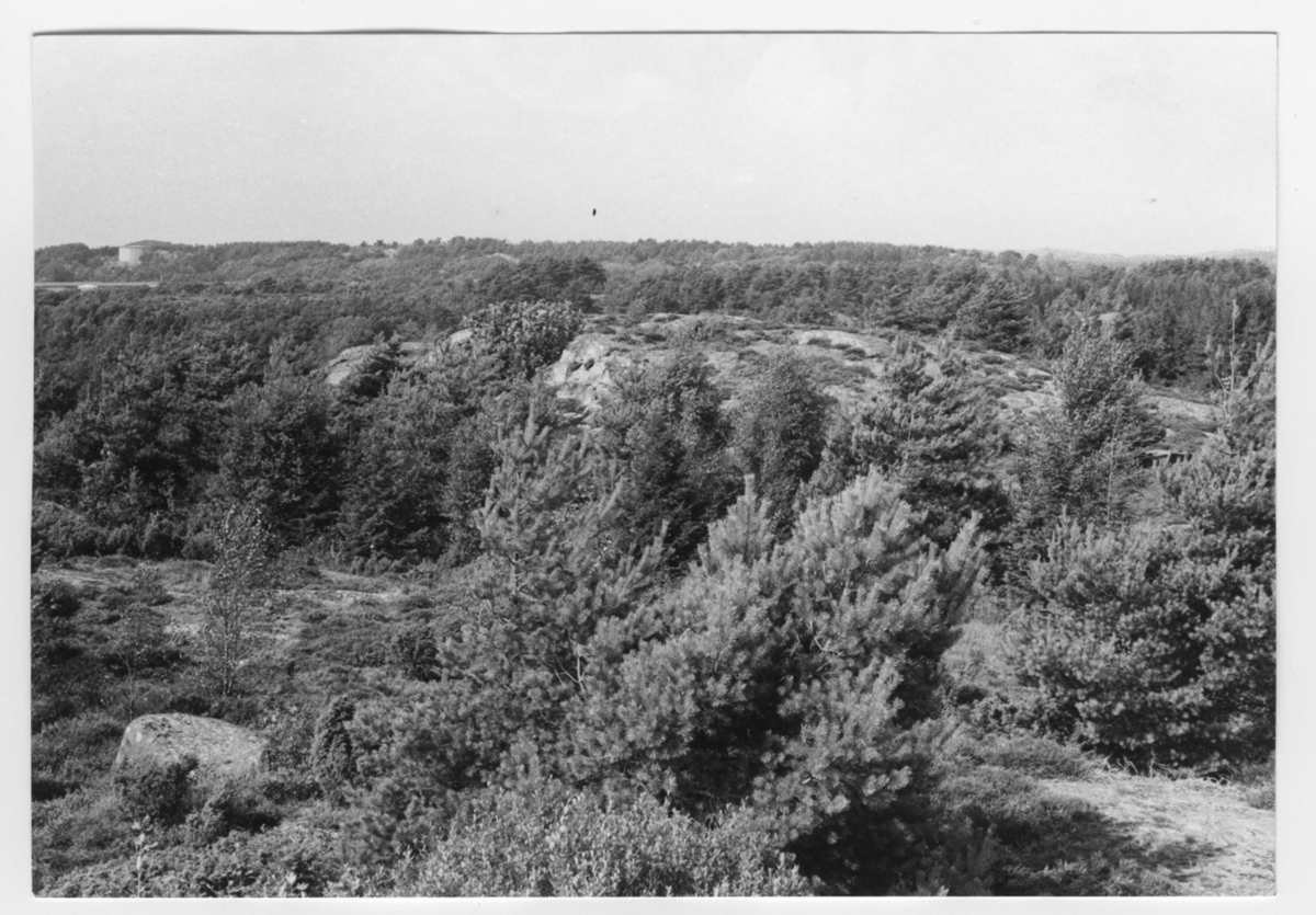'Bildtext: ''Skogbevuxet hällandskap. Riktning 320.'' :: Vy över berghäll bevuxen av furu, lövträd och med lösa stenblock. :: :: Ingår i serie med fotonr. 6970:1-1125, dokumentation av Hisingens naturgeografi, visande landskapsformerna i stora drag och gjord inför exploateringen av området. Platserna för fotograferingen finns utsatta på karta i skala 1:4000 som finns på Göteborgs Naturhistoriska musem. Fotoriktningen mättes med kompass i gammalgrader.'