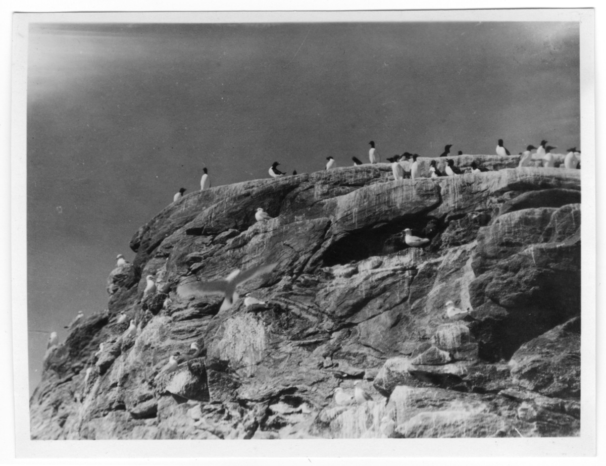 'Vy med berg med alkor och tretåiga måsar. :: Text till fotot: ''Alkor och tretåiga måsar.'' :: :: Ingår i fotonr. 6995:1-51, dessa sitter i ett fotoalbum med tillhörande beskrivningar på norska.'