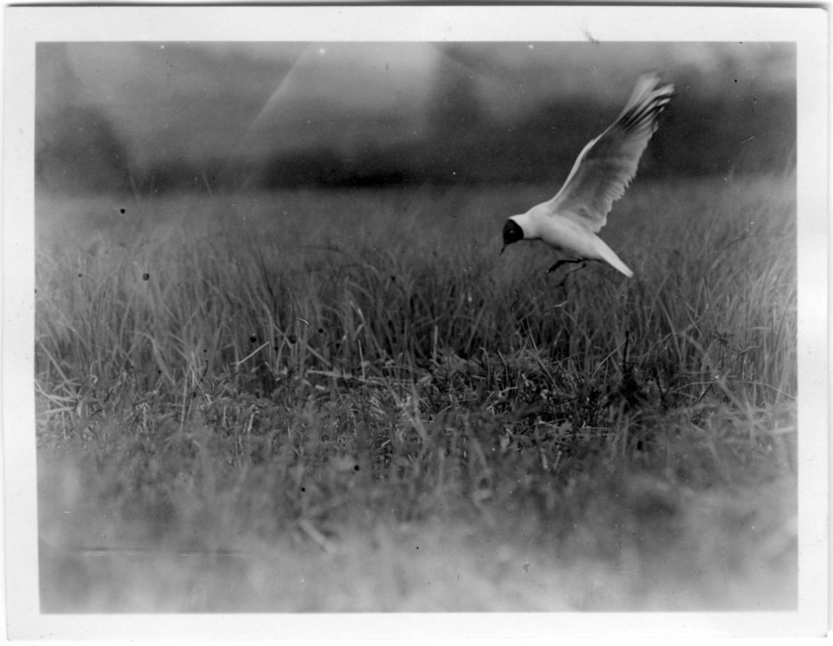 'Skrattmås på väg att landa i högt gräs. :: Text till fotot: ''Skrattmåsen. Här i Sörnypan fann jag i vår en koloni på ca 60 par skrattmåsar och denna utgör den nordligaste häckplatsen för denna fågel.'' :: :: Ingår i fotonr. 6995:1-51, dessa sitter i ett fotoalbum med tillhörande beskrivningar på norska.'