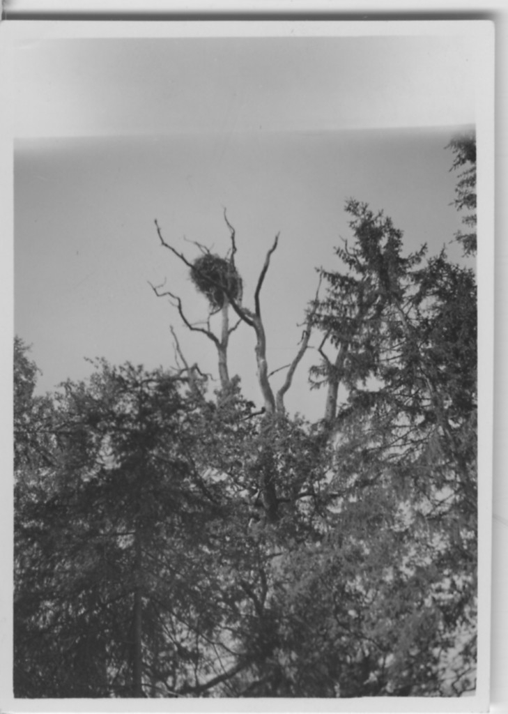 'Biologiska föreningens utfärd till Läckö och Stora Ekens skärgård: :: :: Fiskgjusebo på Stora Eken. Vy upp mot talltopp med boet. Granar omkring. :: :: Se fotonr. 3242-3254, 3255, 3256-3259, 3260-3285 samt 3889-3894.'