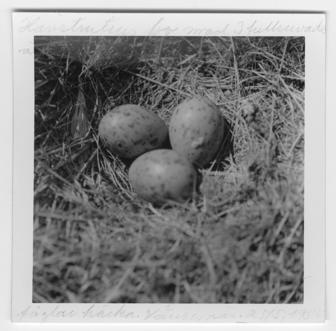 'Bo med 3 ägg av havstrut. :: :: Text på fotot: ''Havstrutens bo med 3 st fullruvade ägg på ett skär, där inga fåglar häcka. Kolonin bestod av ca 15 par.'' :: :: Ingår i serie med fotonr. 4545:1-34.'