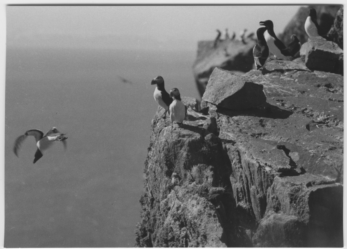 'Tordmular och lunnefåglar, fågel på väg att landa på klippa samt fåglar på klippa. Vy med havet. :: :: Ingår i serie med fotonr. 3382-3407.'