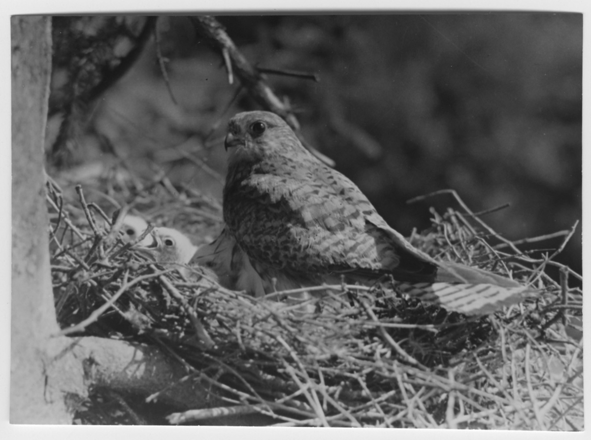 'Tornfalkhona värmer sina ungar i boet, i gran. Närbild. :: :: Ingår i serie med fotonr. 3550-3567. Se särskilt fotonr. 3555-3558.'