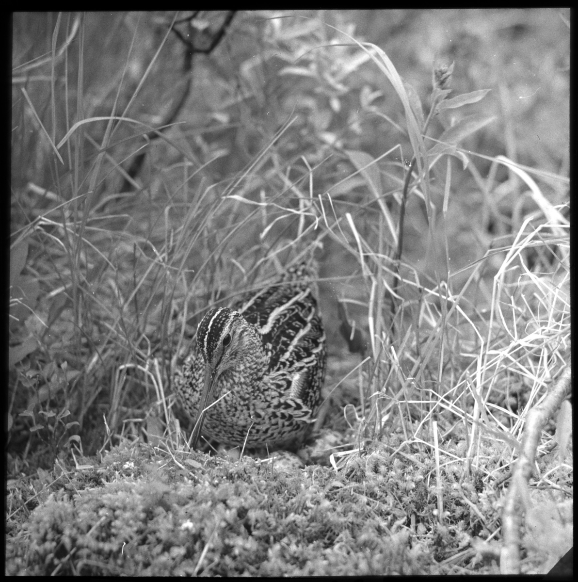 'Bildtext: ''Dubbelbeckasin.'' 1 dubbelbeckasin sedd framifrån, på boet med ägg. Se även fotonr. 5169:6. :: :: Ingår i serie med fotonr. 5169:1-8, numrerade med bildnr 247-254. Se även hela serien med fotonr. 5155-5174.'
