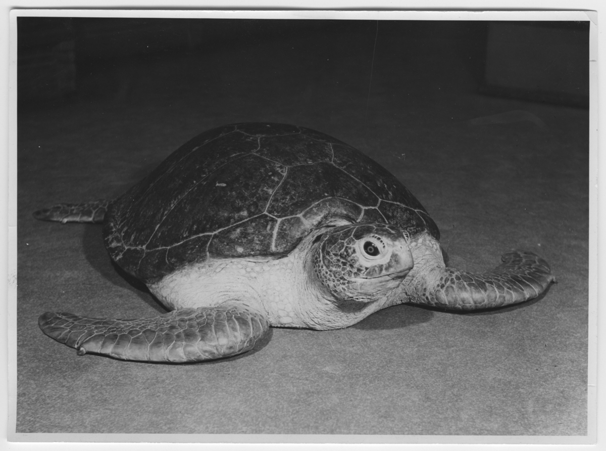 Havsskölpadda. Monterad av Hilmer Skoog, liggande på golvet i museet.
