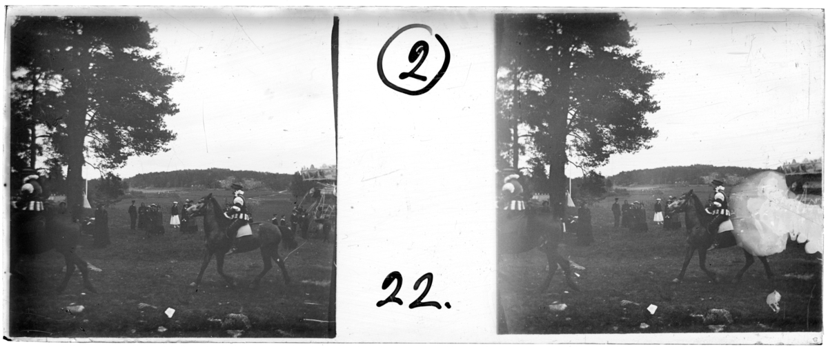 'Bildtext: ''Skyttefesten.'' :: Vy över öppen gräsmark med i förgrunden 2 ryttar till häst ev. utklädda. I bakgrunden syns åskådare, grupp människor, män, kvinnor. Till höger syns en slags karusell. Kläder. Klädsel. Sporrar. :: :: Ingår i serie med fotonr. 5258:1-16. Se även hela serien med fotonr. 5237-5267.'