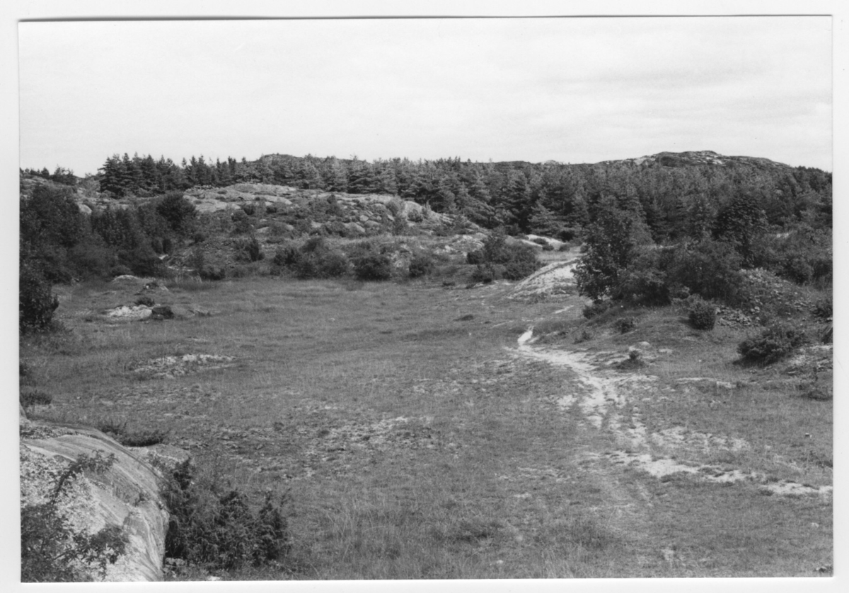 'Bildtext: ''Sänka med skalgrus. Riktning 60.'' :: Vy med öppen yta med gräsvegetatiion och på vissa ställen blottad skalgrus. På avstånd berghäll och barrträdsvegetation. :: :: Ingår i serie med fotonr. 6970:1-1125, dokumentation av Hisingens naturgeografi, visande landskapsformerna i stora drag och gjord inför exploateringen av området. Platserna för fotograferingen finns utsatta på karta i skala 1:4000 som finns på Göteborgs Naturhistoriska musem. Fotoriktningen mättes med kompass i gammalgrader.'