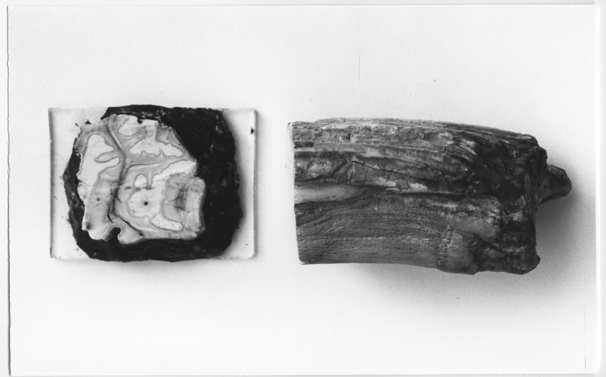 'Närbilder på tand, snitt samt sedd från sidan. Tand, 2:a eller 1:a molaren i höger överkäke. :: :: Ingår i serie med fotonr. 5634:1-6.'